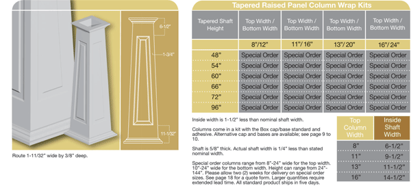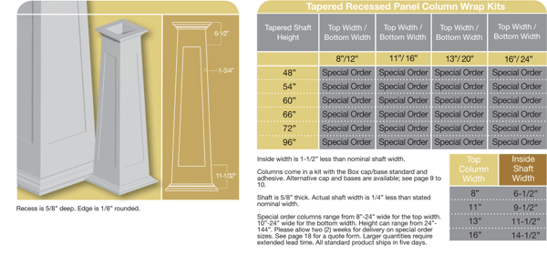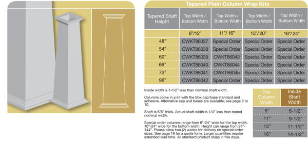 Product Specs: The Tapered Column Wraps are constructed of a .625″ thick material. Craftsman style caps and bases come standard with all Tapered Column Wraps. Optional cap and base styles are available.
